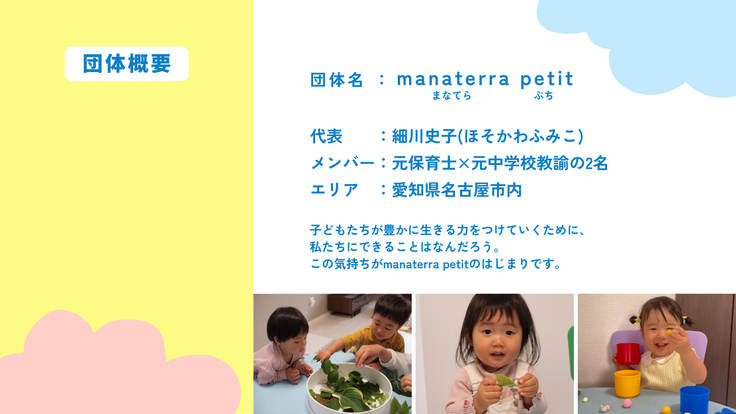 元中学校教諭×元保育士の強みを生かして、名古屋の子育てを盛り上げたい。私たちはそんな思いで生まれました。「基礎となる力を学んで育む寺子屋のような存在になれたら」と願いを込めmanaterra petit(まなてら ぷち)と名付けました。terraはさまざまな言語の起源となるラテン語で「大地」「基盤」といった意味を指します。 子どもたちが、これからの未来を豊かに生きるための基盤となる力を育てられるように走り続けていきます!!!