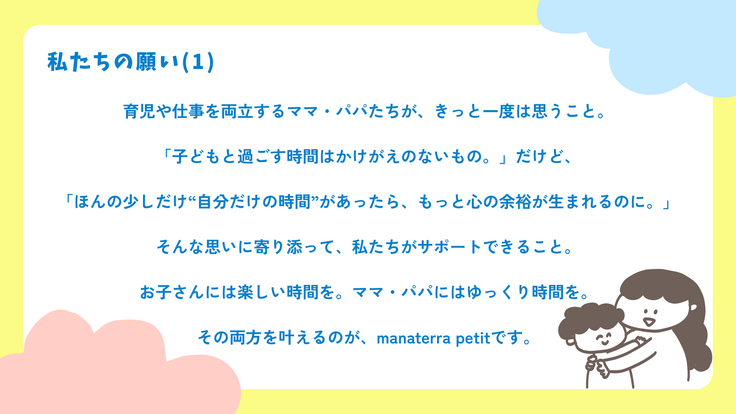 「manaterra petit」は、1歳0か月〜3歳0か月の子どもを対象とした、知育プログラム付きの一時預かり教室です。
