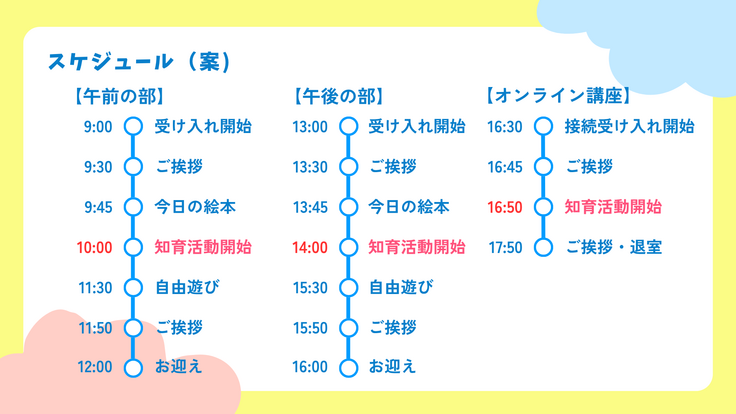 (親子で参加できる日と大人単独で参加できる日は分けさせていただきます。)