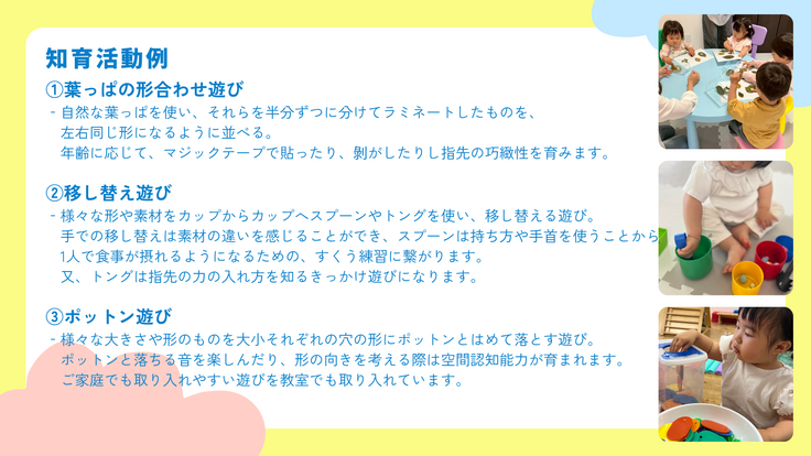 ただ預かるのではなく、五感を育む「遊び×学び」のコンテンツを通じて、子どもがぐんぐん育つ時間を大切にします。