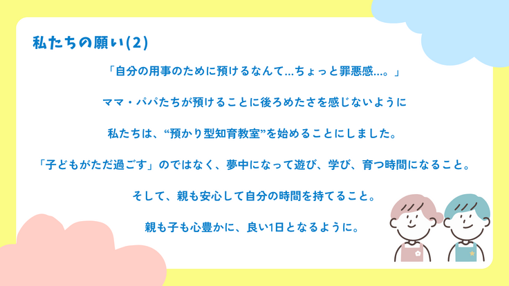 だからこそ、 親が安心して預けられ、子どもも夢中になって学べる。そんな “親子のための知育教室” を作りたい。
