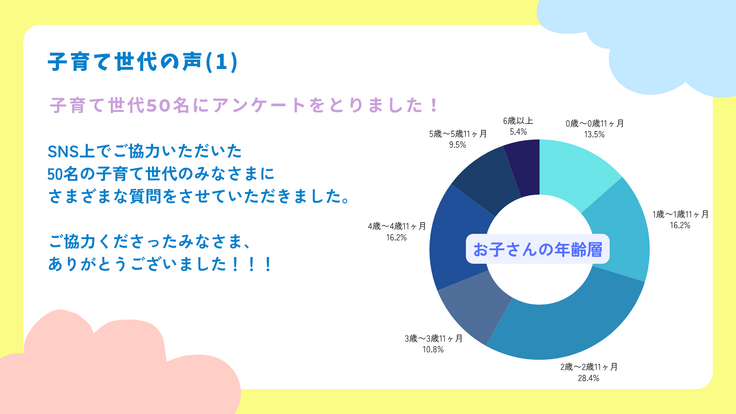 今回アンケート調査にご協力いただいた50名の子育て世代のみなさまからはここには載せきれないほどたくさん嬉しいお言葉をいただきました。