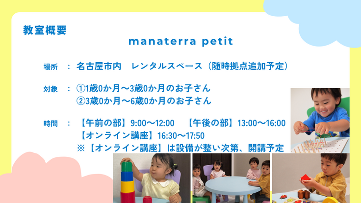 このたび、愛知県名古屋市で元保育士のメンバーと一緒に「manaterra petit(マナテラ プチ)」という預かり型知育教室を立ち上げることになりました。