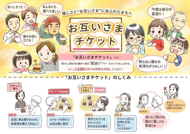 ※『お互いさまチケット』とは、震災から復興する福島の街で広がった、「受け取った恩を次の誰かに渡す」 というコンセプトのチケットです。