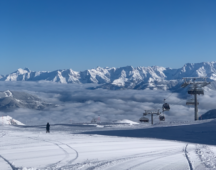 最初の乗り場から、4本のゴンドラを乗り継いでトレーニングスロープに向かいます。標高が高いため、下の街の天気が悪くても、上は雲が抜けていることも多く、そのような日には素晴らしい雲海の景色を見ることができます。