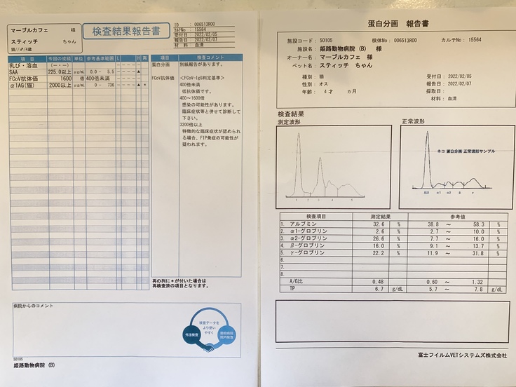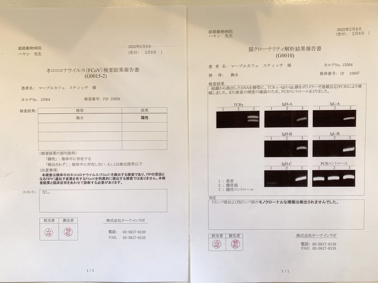 結果は、やはりFIP猫伝染性腹膜炎でした。
