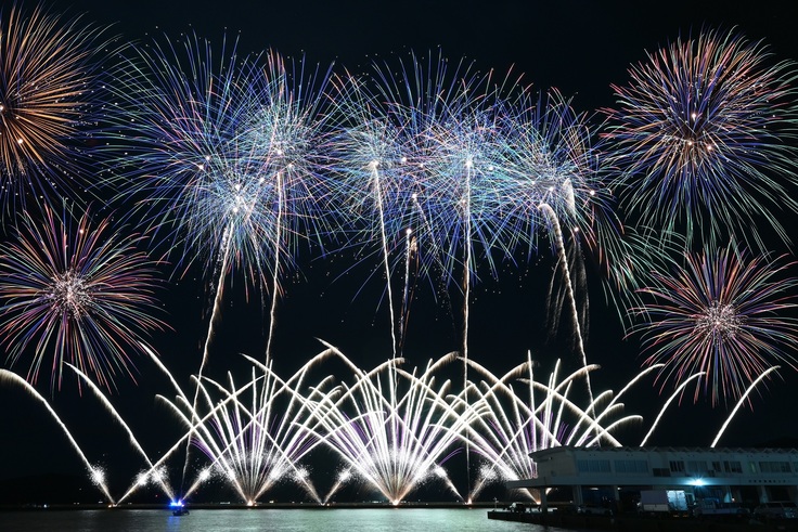 毎年8月1日に開催される若狭マリンピア花火大会は、小浜漁港内の一文字防波堤で打ち上げを行い、
