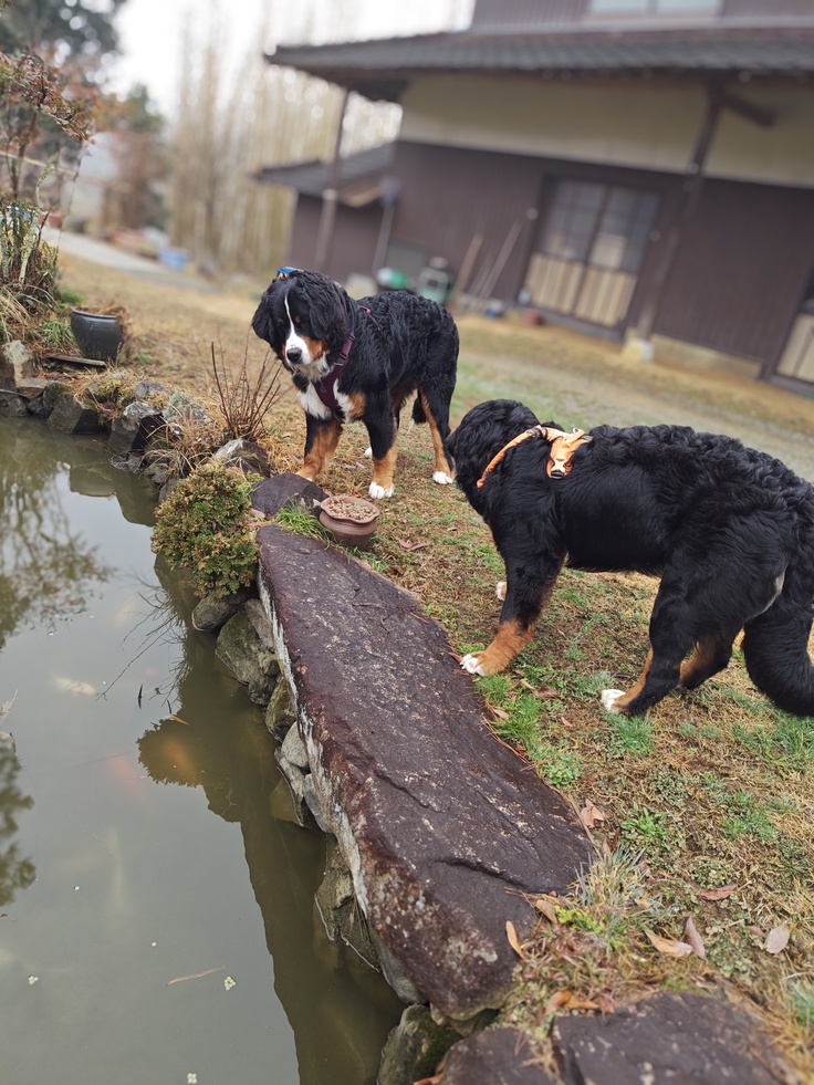 つい先日まで池に氷が張っていて中の様子が見えなかったが、氷が溶けて鯉が泳ぐ姿が見えるようになった。ワンズは不思議そうに池の中を覗き込んでいる。