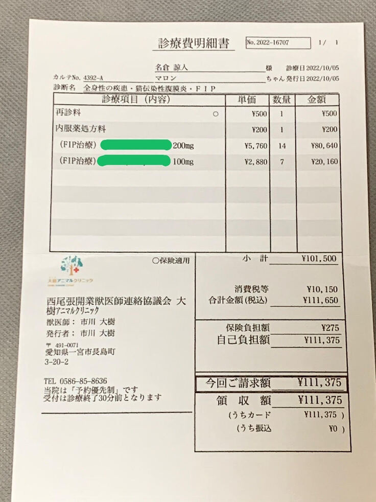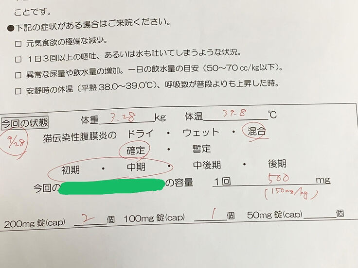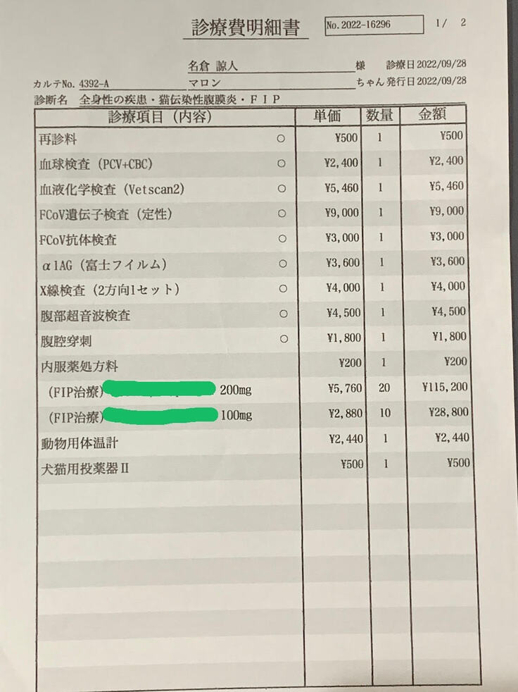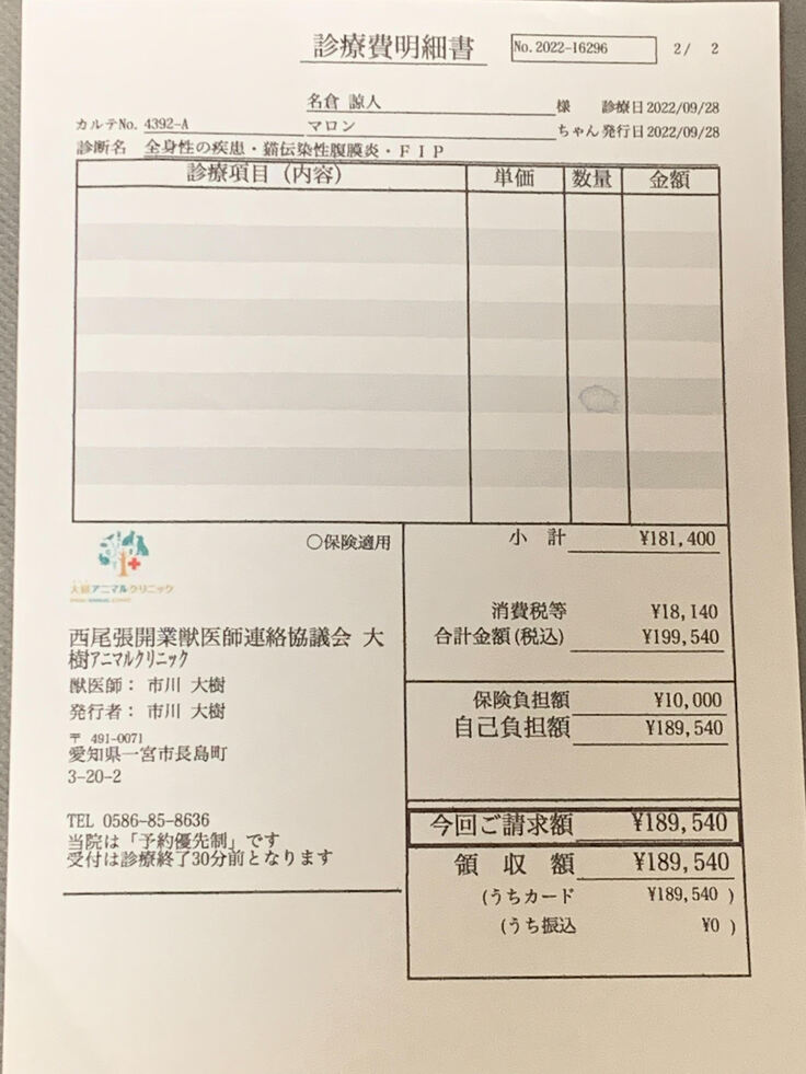 主治医からは「FIP(猫伝染性腹膜炎)は判断のタイミング次第では手遅れになってしまう、すぐにどうするか決めてください」とのことでした。