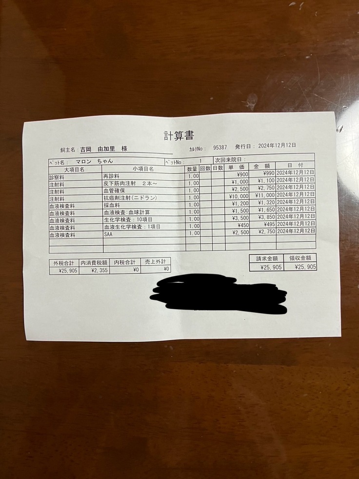 今回の治療費用はステロイド注射も行い、25,905円になります。
