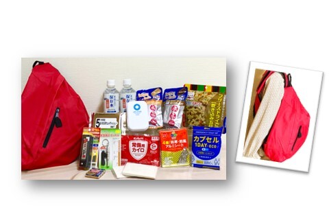 また、学校や会社で待機する際や交通機関が止まり帰宅困難者になってしまった際、徒歩で帰るにも持ちやすいショルダーバッグ入りの簡易防災セット。食料や保存水をはじめ、笛や簡易トイレ、LEDライトetc持ち歩きやすいよう最低限必要なアイテムを揃えています。
