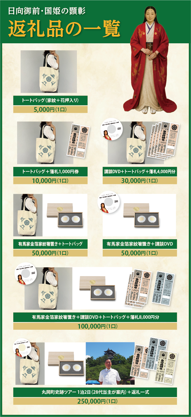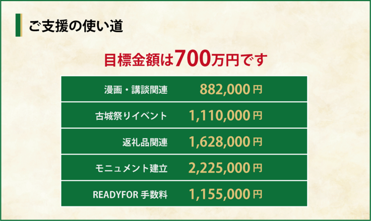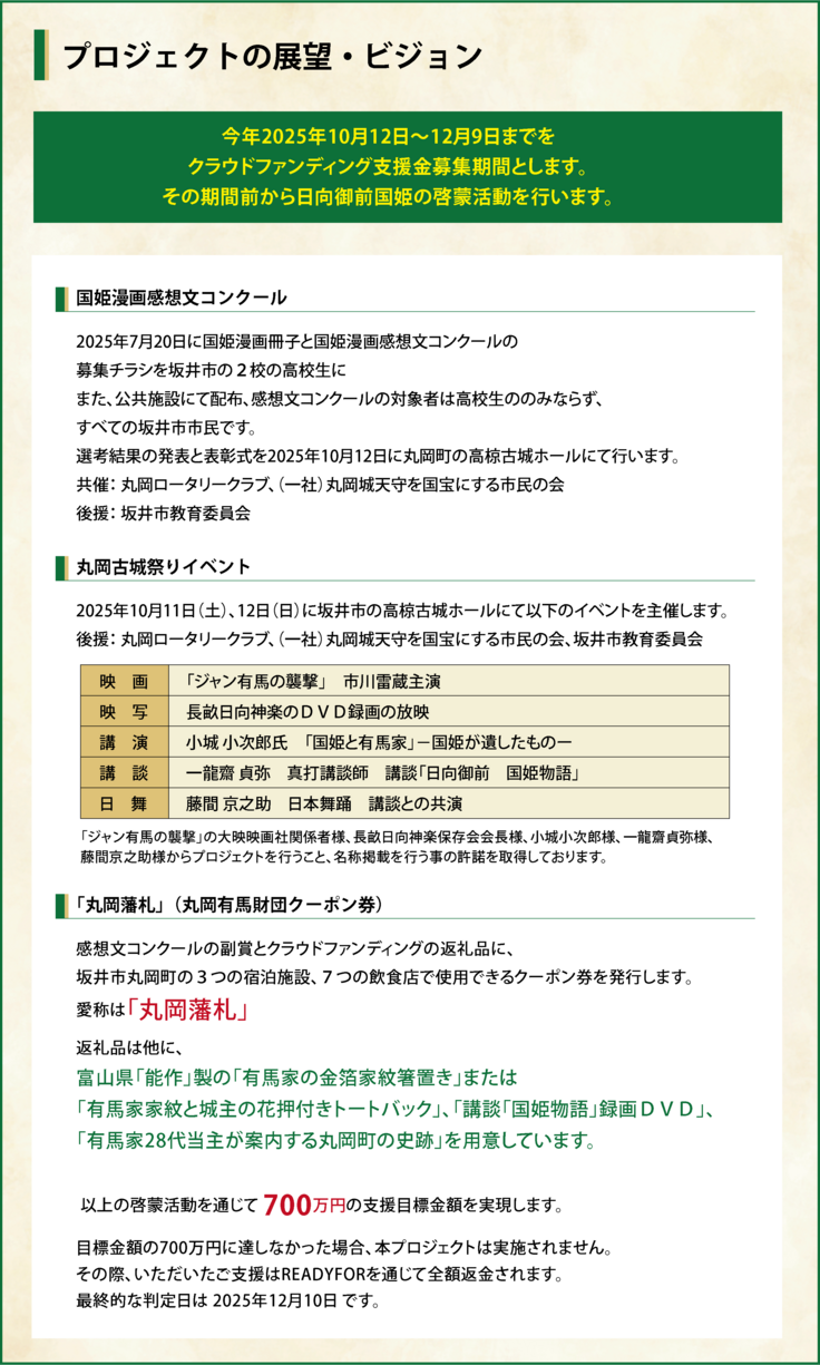 一財)丸岡有馬財団が、日向御前国姫の顕彰モニュメントを建立し、除幕式を2026年10月に行う。支援金の募集以前から国姫の啓蒙活動を行う。国姫漫画感想文コンクールを2025年7月から10月12日まで主催。また、丸岡城古城祭りのメインイベントとして、一財)丸岡有馬財団が、2025年10月11日と12日にキリシタン大名有馬晴信の映画、日向神楽の放映と講演「国姫を巡る歴史探訪」、講談「日向御前 国姫物語」を日舞とのコラボで上演する。 (1)丸岡有馬財団が感想文コンクールの副賞、クーポン券を8名、計9万円提供、その他を含め、 計122,000円 (2)丸岡有馬財団が古城祭りのイベント費用、会場、スタッフ、出演者、カメラマン、その他含めて出費。 計1,110,000円 (3)国姫漫画制作、漫画冊子制作、講談「国姫物語」制作、講談初披露と録画等に出費。 計760,000円 (4)国姫顕彰モニュメントの建立に支出。 計2、225、000円 (5)返礼品の型を含め、返礼品総額は、計1,628,000円 (6)READYFOR支援料が、計1,155,000円 総計 700万円