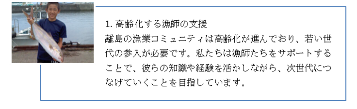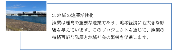 このプロジェクトに参加いただくことで、離島の漁業とコミュニティの未来に貢献できる素晴らしい機会となると信じています。どうぞよろしくお願い申し上げます。