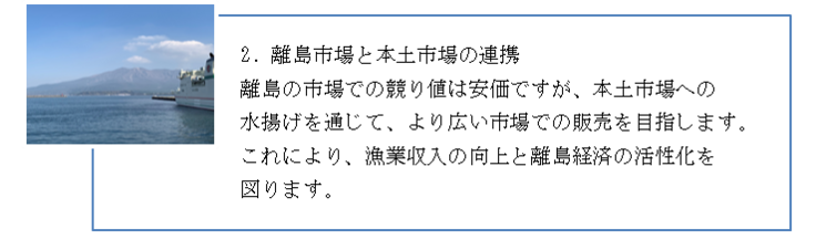 現在は、宮之浦港を拠点にしている漁師の方に協力をいただき水揚げの一極集中化を進めています。また、鹿児島市中央卸売市場への出荷に向けた調整に取り組んでいます。