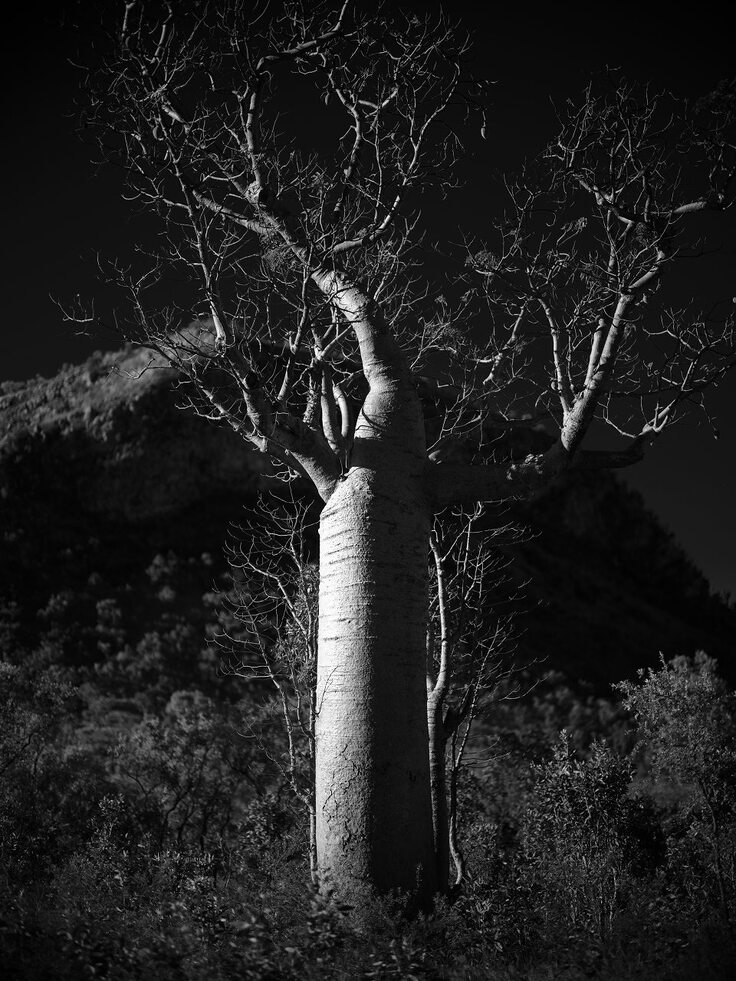 バオバブはとても個性的。1つ1つがとても形が異なりフォトジェニック。そお面白い形の表現するために、朝夕の斜光を使い木の輪郭が光と陰で強調されるように撮影した。それはとりもなおさずハイライト(明るい部分)とシャードー(暗い部分)のコントラストが強くなる。特にシャドー部の諧調表現がとても大切。つぶれそうでつぶれない、暗い中にも豊かな諧調があり、それを表現したい。