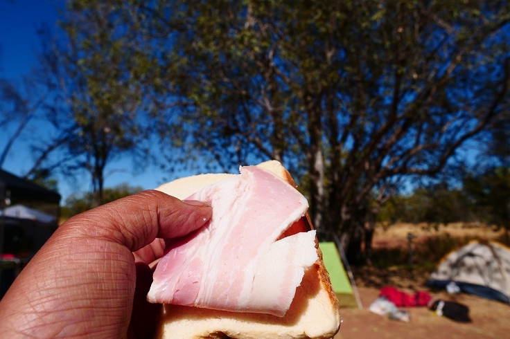 撮影中は忙しいので、ご飯はシリアルとかバナナとか、あとはパンに生のベーコン。食事は単に体の生命維持のための栄養やビタミン補給で、味わいとか度外視です。もちろんブッシュキャンプなので、野戦キャンプ。日本の皆さんが想像するアウトドアライフとはかけ離れた世界。もちろんシャワーとかありません。