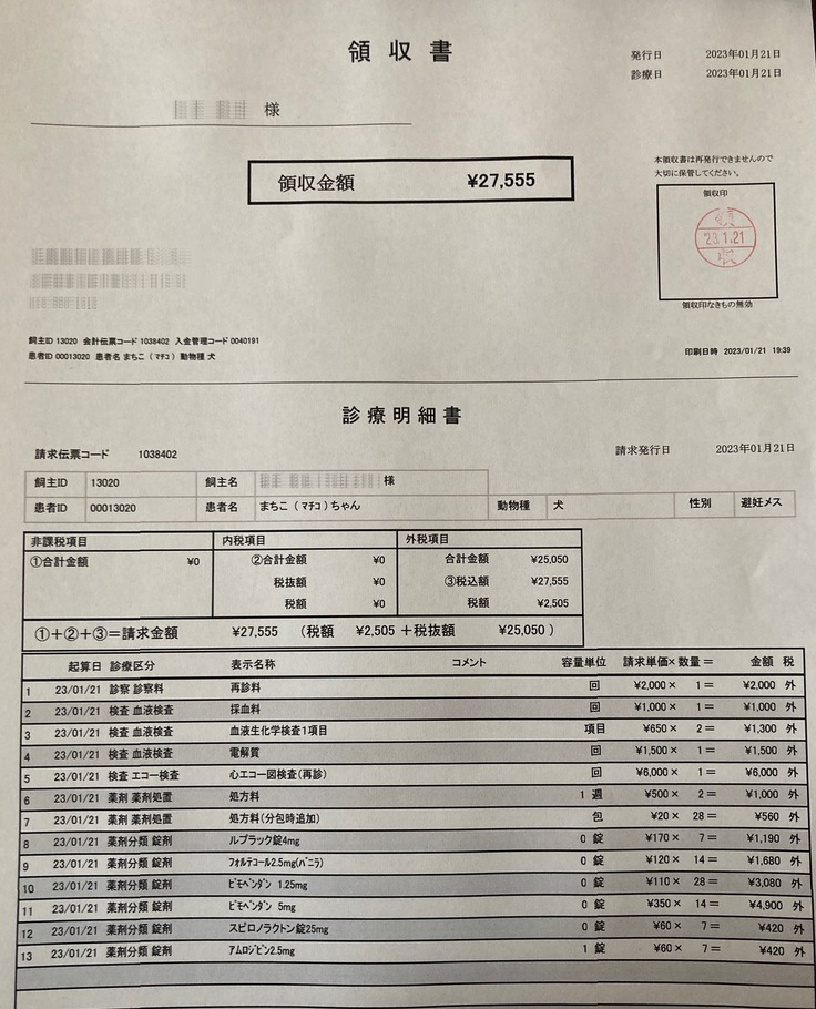 心臓エコー検査、利尿剤の影響を調べるための血液検査をしていただきました。