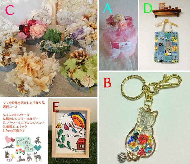 「ミニおむつケーキ」「レジンのキーホルダー」「フラワーミニアレンジメント」「携帯エコバック」「2way写真立て」の5点の中からお好きなものを選ぶことができます。グッズはイベントなどでいつも人気のある弊会会員のハンドメイド品です。