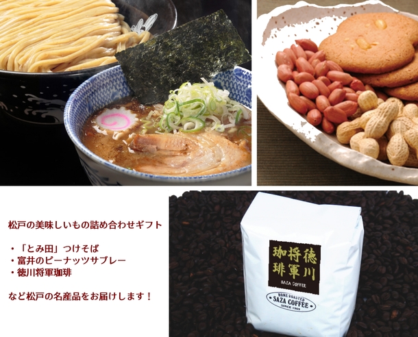 「とみ田」つけそば、富井のピーナッツサブレー、徳川将軍珈琲など松戸の名産品を詰め合わせた食べ物を送らせていただきます。