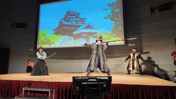 ステージでは、高橋英樹さんをはじめ、ご当地キャラの三英傑「しまねっこ・くまもん・ひこにゃん」も大集合。また、まつえ若武者隊による時代劇「時代錯誤にもほどがある」では、会場が笑顔につつまれました。