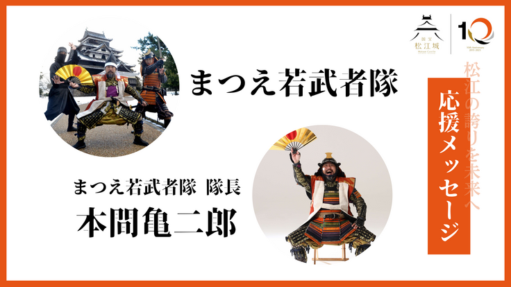 四百年前、慶長の御世から参じ、現代の松江を盛り上げるべくおもてなし活動をしている、まつえ若武者隊から応援メッセージをいただきました。まつえ時代案内人の武者たちと同じく、国宝10周年を盛り上げる仲間として、心強く思います!