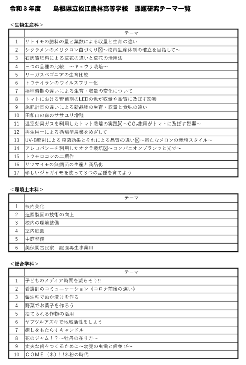 松江農林高校では生物生産科・環境土木科・総合学科の生徒たちが様々な研究に取り組んでいます。
