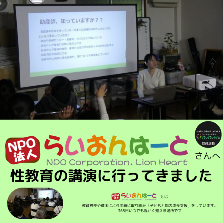 先日NPO法人らいおんはーとさんへ、ユースウエルネスKuKuNa室長 幸﨑が性教育講座に行ってきました。