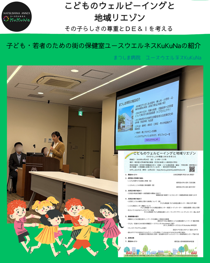 順天堂大学D棟7階会議室で開催された「こどものウェルビーイングと地域リエゾン」に登壇しました