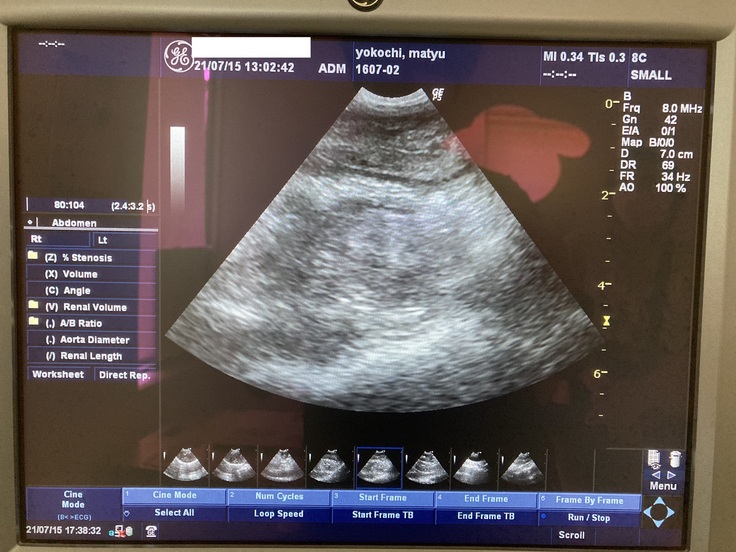 エコー検査結果(エコー画像上部に写る腸管の軸位断に腫れ上がりが認められています)