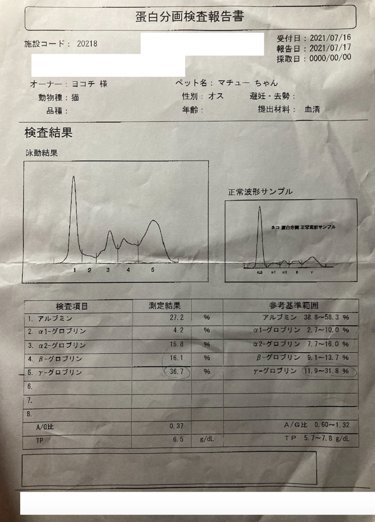 腸壁がひどく腫れ上がっていること。黄疸が出ておりビリルビンの数値が基準値の10倍以上であったこと。A/G比が低かったこと。所見として下痢、食欲不振、体重減少が見られていることから、FIP(猫伝染性腹膜炎)の可能性が高いと伝えられました。