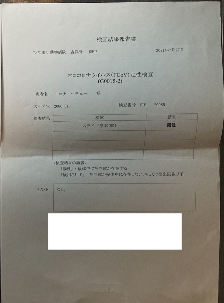 また後日、かかりつけの動物病院とは異なるFIP協力病院にて猫コロナウィルス定性検査を外注したところ、陽性反応となりました。