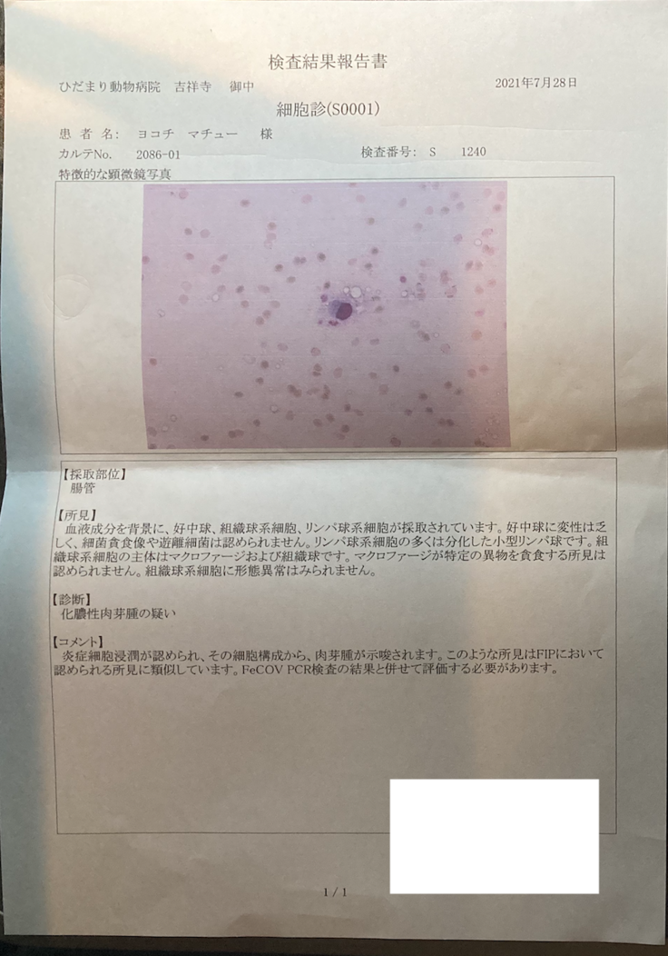 さらに細胞診では化膿性肉芽腫の疑いがあると診断されたことで、FIPが確定となりました。