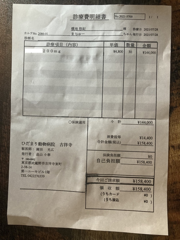 体重やFIPの進行度によって投与量は変わりますが、体重2.6kg(投薬初日の7月29日時点)のまちゅーには1日400mgの投薬が必要で9600円の費用がかかります[2]。また、現在30日分の治療薬を保有しているので以下を治療費の内訳とさせていただきます。