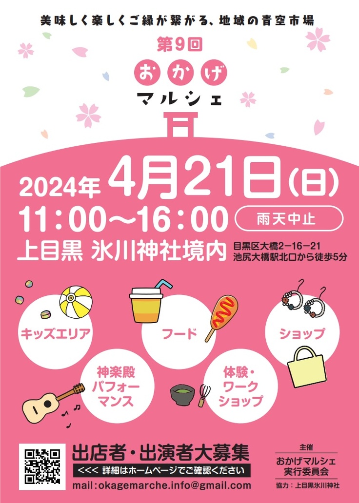 4月21日(日)11:00〜16:00まで、上目黒氷川神社境内で第9回おかげマルシェが開催されます。