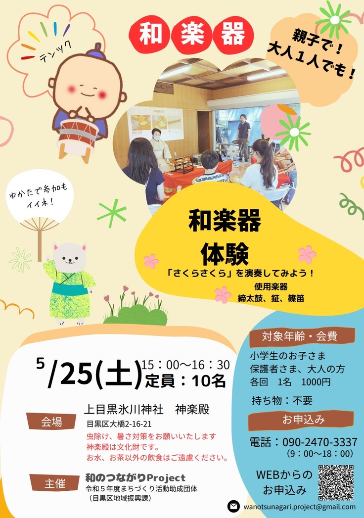 5月25日(土)15時〜16時30分まで、和のつながりproject様主催による、「和楽器体験」が上目黒氷川神社神楽殿にて開催されます。