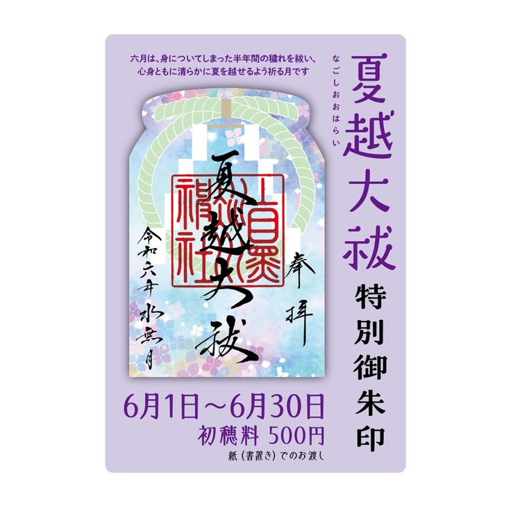 6月1日から6月30日までの期間、夏越大祓特別御朱印を頒布致します。