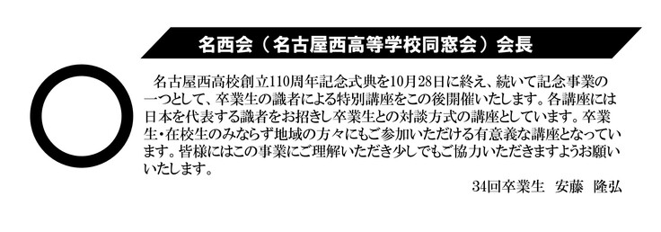 愛知県立名古屋西高等学校の同窓会『名西会』です。名西会では、創立110周年記念実行委員会を発足し、周年記念行事へ向けた取り組みを実施/運営しております。