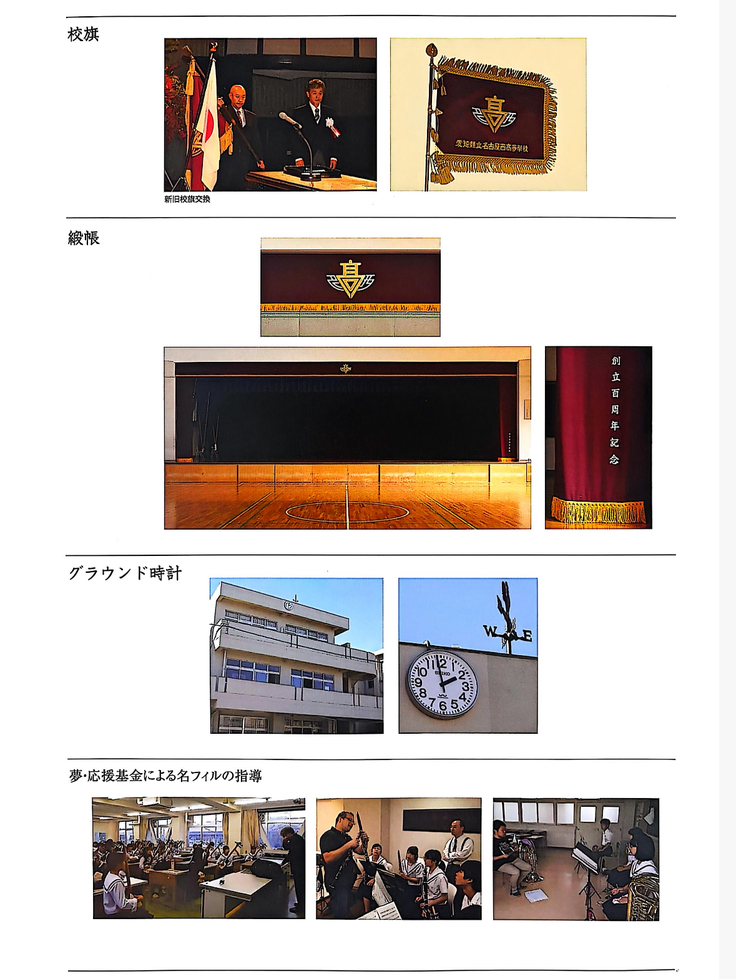 100周年の際には、名西会より下記学校支援事業の他に、100周年記念モニュメントが寄贈されました。