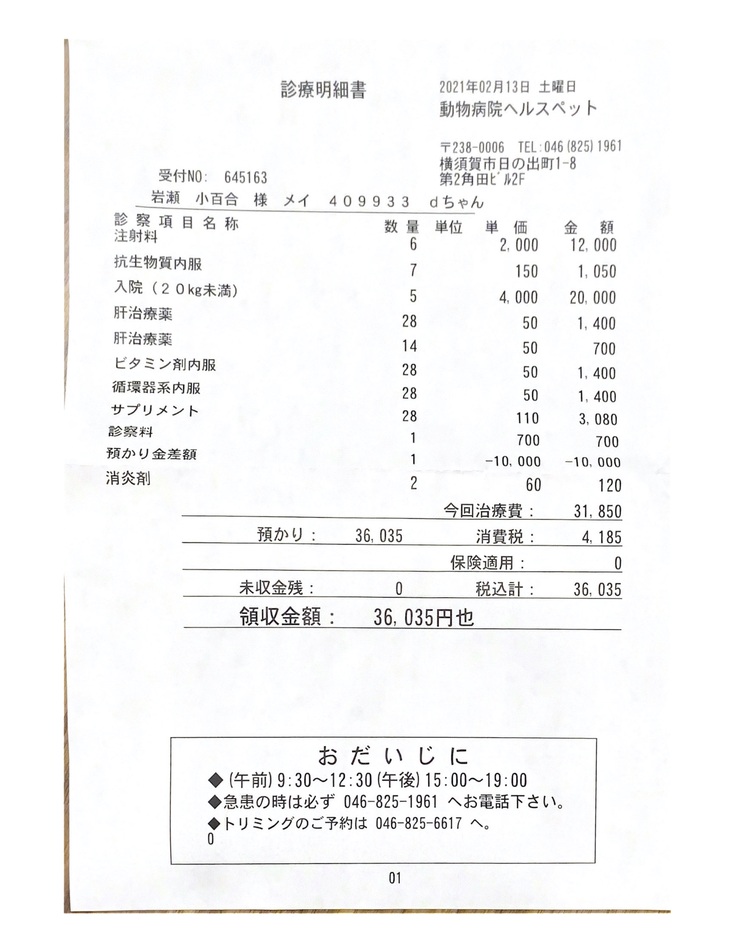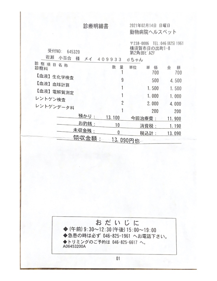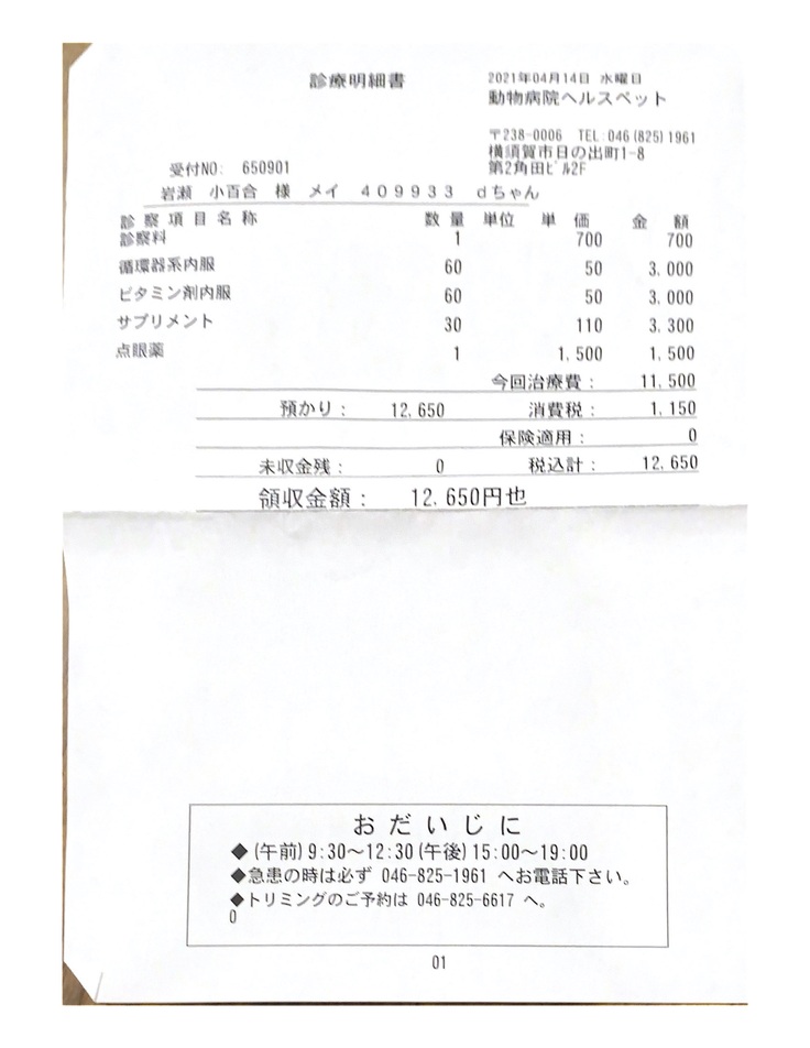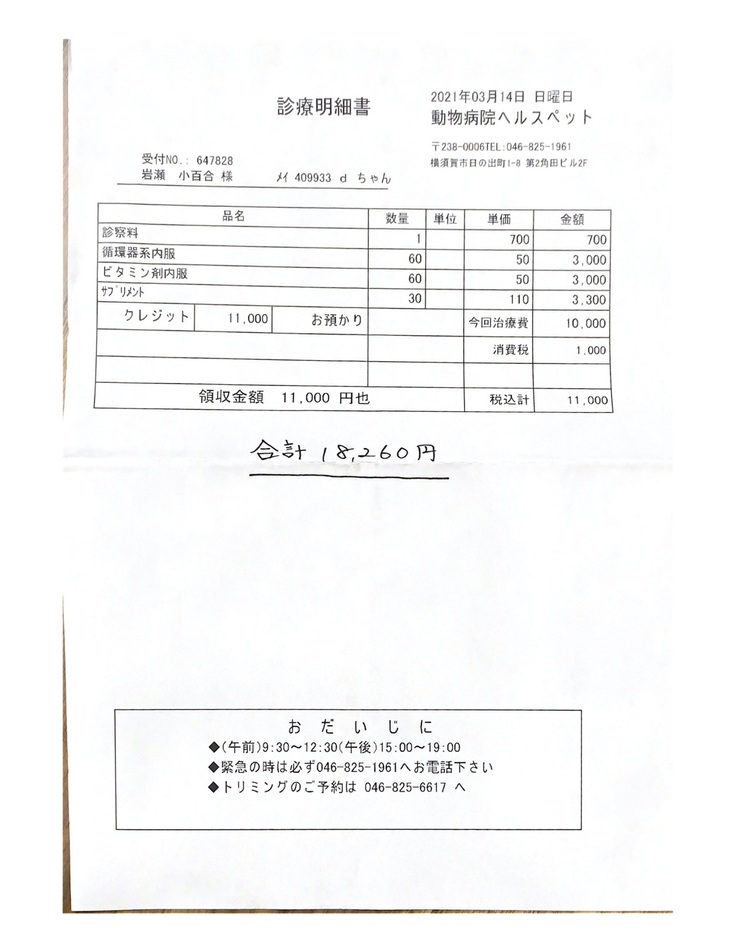 イヴの元気さや食欲がある事など色々悩んだ結果、抗癌剤をする事を決断して投薬をスタート。