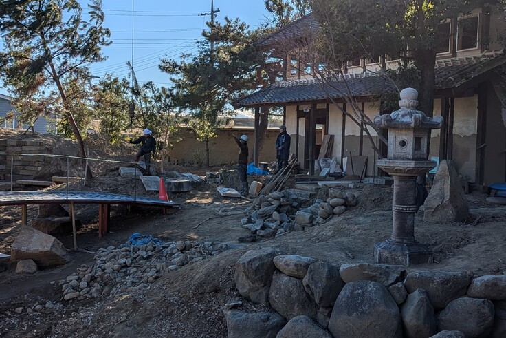 置場に眠っていた子たちが続々とめいわの杜に運ばれています。古材と言われる貴重な石達が、主人の手によりどんな表情を出すのか・・・