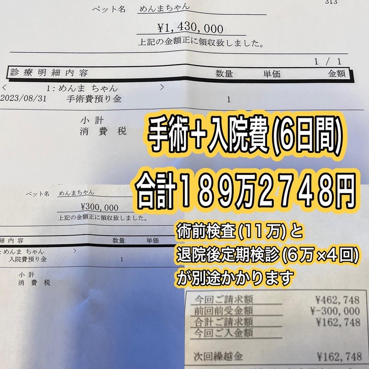 それ以外に、術前検査で11万円、退院後の定期検診が1回6万円のものが4回あるので24万円かかります。