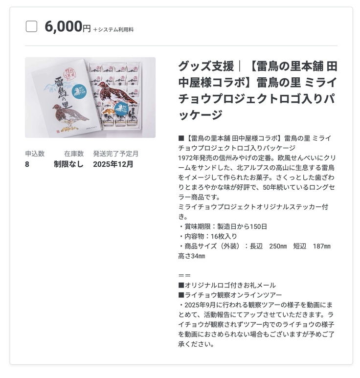 リターンのご紹介|【雷鳥の里本舗 田中屋様コラボ】雷鳥の里 プロジェクトロゴ入りパッケージ