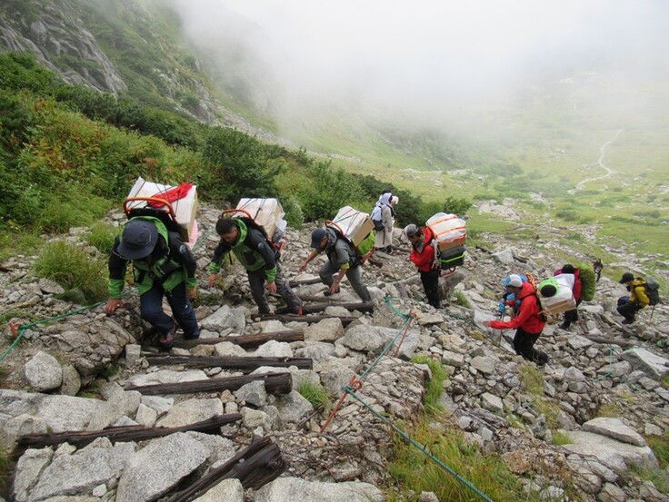 千畳敷からは環境省の職員がライチョウを入れた段ボールを背負って運び上げました。(写真:環境省提供)