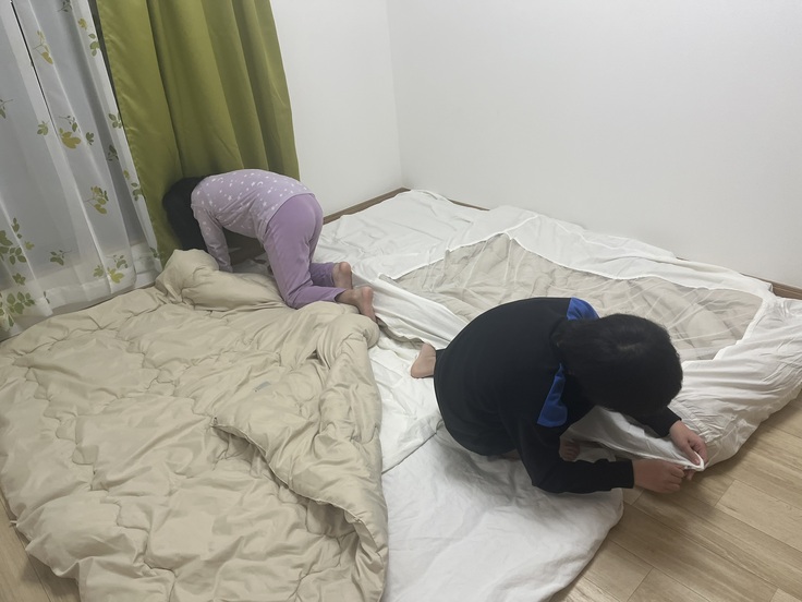 「自分で布団を敷いてみたい!」と挑戦する子どもたち