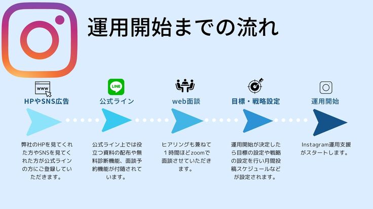 導入前のzoom面談ではInstagram運用の現状を細かくヒアリングさせていただき弊社としてもどのような形でお手伝いできるのかご提案させていただき戦略をどのようにしたらいいのか、どのような目標設定をするか、実際に導入したらどのような結果が得られるのかお話しさせていただきます。