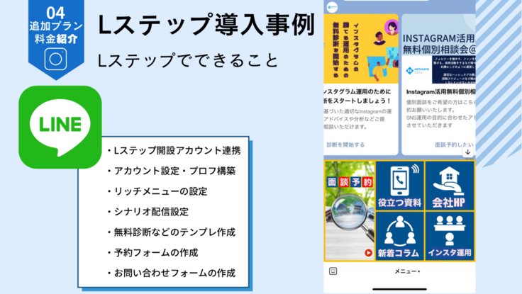 また弊社公式ラインでは日々Instagram運用における情報発信を行っており、ラインから面談予約やプラン申し込みができるようになっております。