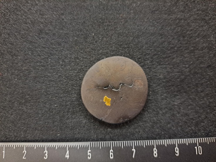 果たして隕鉄に象嵌ができるのかどうか。大住さんに相談すると、できるかどうかわからない、隕鉄中に傷が多いようであれば難しいかもしれない、とはじめは慎重でしたが、挑戦してみようと松山で鍛造し成形した隕鉄の小型円盤を受け取っていただきました。隕鉄はカンポ・デル・シエロ産。大まかに形を整えて、さらに両面を研磨すると数の細かな亀裂がありました。それでも大住さんには取り組んでいただきました。
