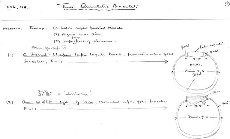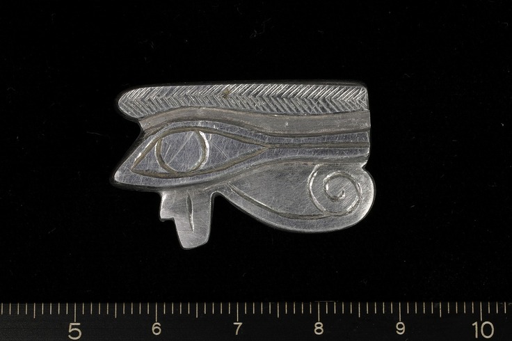 このプロジェクトでは利器(刃物)以外の隕鉄製鉄器にも挑むことを新たなチャレンジの目的として設定しました。そのなかに装身具があるのですが、なかでも最も複雑で難しいのがエジプト、ツタンカーメン王墓より出土した「ウジャトの目」です。「ホルスの目」とも呼ばれます。ウジャトの目は守護や魔除けの護符として古代エジプトで使用されてきたものですが、ツタンカーメン王墓には、エジプト唯一となる隕鉄製品が副葬されていました。