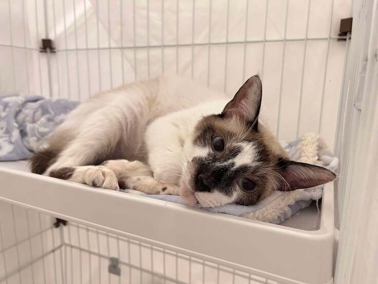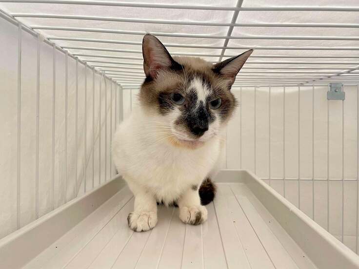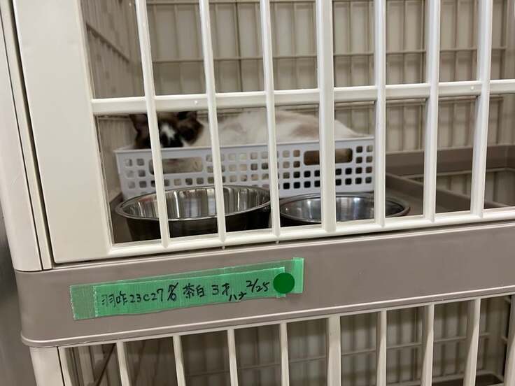 シャムミックスのラッキーちゃんは、能登半島地震の発災から1か月半余りが過ぎて、飼い主さんが飼育の継続を断念し、能登中部保健福祉センターに収容されました。
