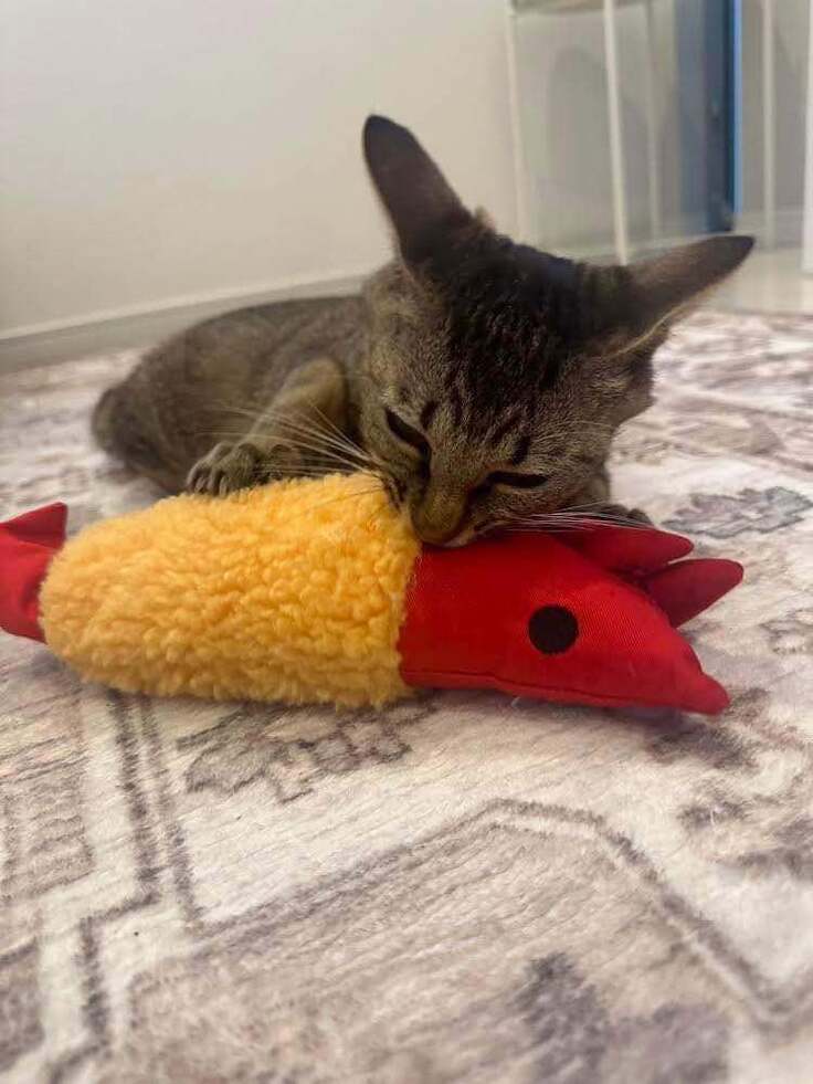 買ってきたおもちゃはもれなくおもいっきり遊んで、食欲も旺盛!元気いっぱいに過ごしています。 餌をいろいろと試しているなか、アレルギーがあったようで一時首の痒みが復活してしまいましたが、今は落ち着いております。